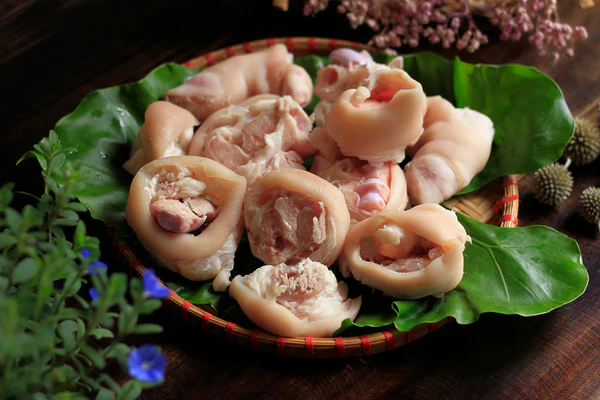 Móng giò cạo sạch lông, chặt khoanh tròn, trụng sơ nước rồi cho bớt tạp chất, rửa sạch để ráo nước. Ướp móng giò với chút dầu màu điều, gia vị cho đậm đà.