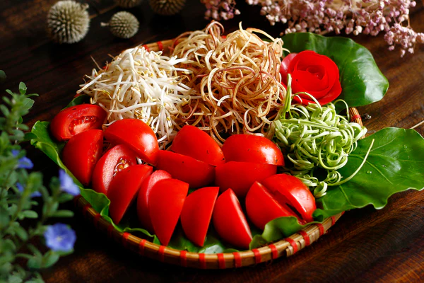 Cà chua thái múi cau. Các loại rau thơm, rau sống ăn kèm rửa sạch, vẩy ráo nước.
